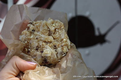 This fantastic food is served up by the hilarious and thoughtful Adam Sobel, a graffiti artist turned chef who knows that introducing people to vegan food can help make the world be a better place, health-wise and environmentally. To sum up what he wants to accomplish with his food, check out what's written on the side of the truck: "Food to help you transform into a being of pure light who can serve all living creatures simultaneously and eternally." In my opinion, he's certainly achieving that. In fact, lots of people must agree - there was a line of customers the entire hour that I was there, and Adam said that was a slow day. One of my favorite stories that he told me was of the police officiers who were skeptical of the vegan food until they tried his donuts, who eventually tried actual meals off the truck and became regulars - vegan donuts are changing the world!